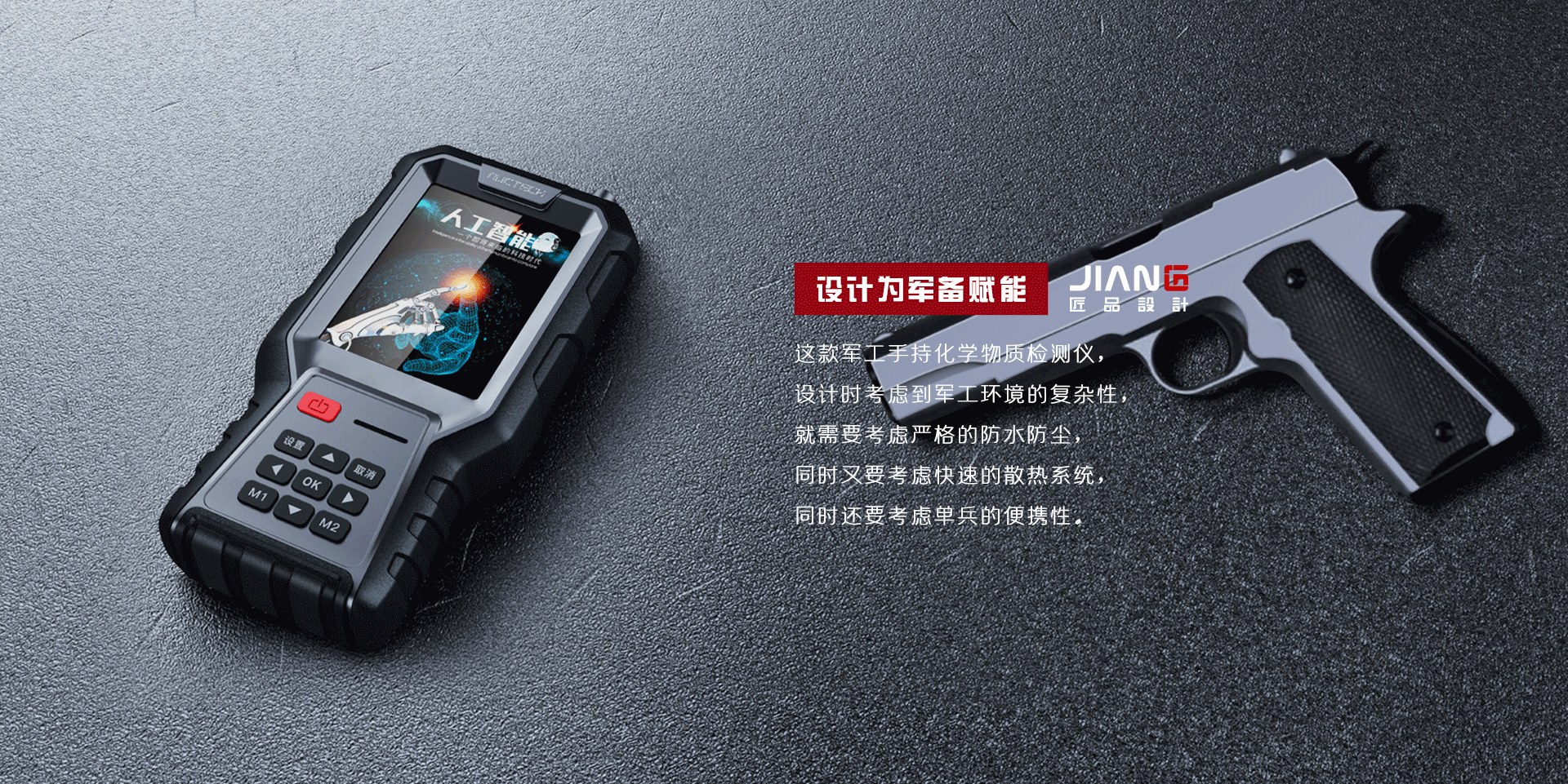 匠品設(shè)計(jì)--這款軍工手持化學(xué)物質(zhì)檢測(cè)儀,設(shè)計(jì)時(shí)考慮到軍工環(huán)境的復(fù)雜性,就需要考慮嚴(yán)格的防水防塵,同時(shí)又要考慮快速的散熱系統(tǒng),同時(shí)還要考慮單兵的便攜性。