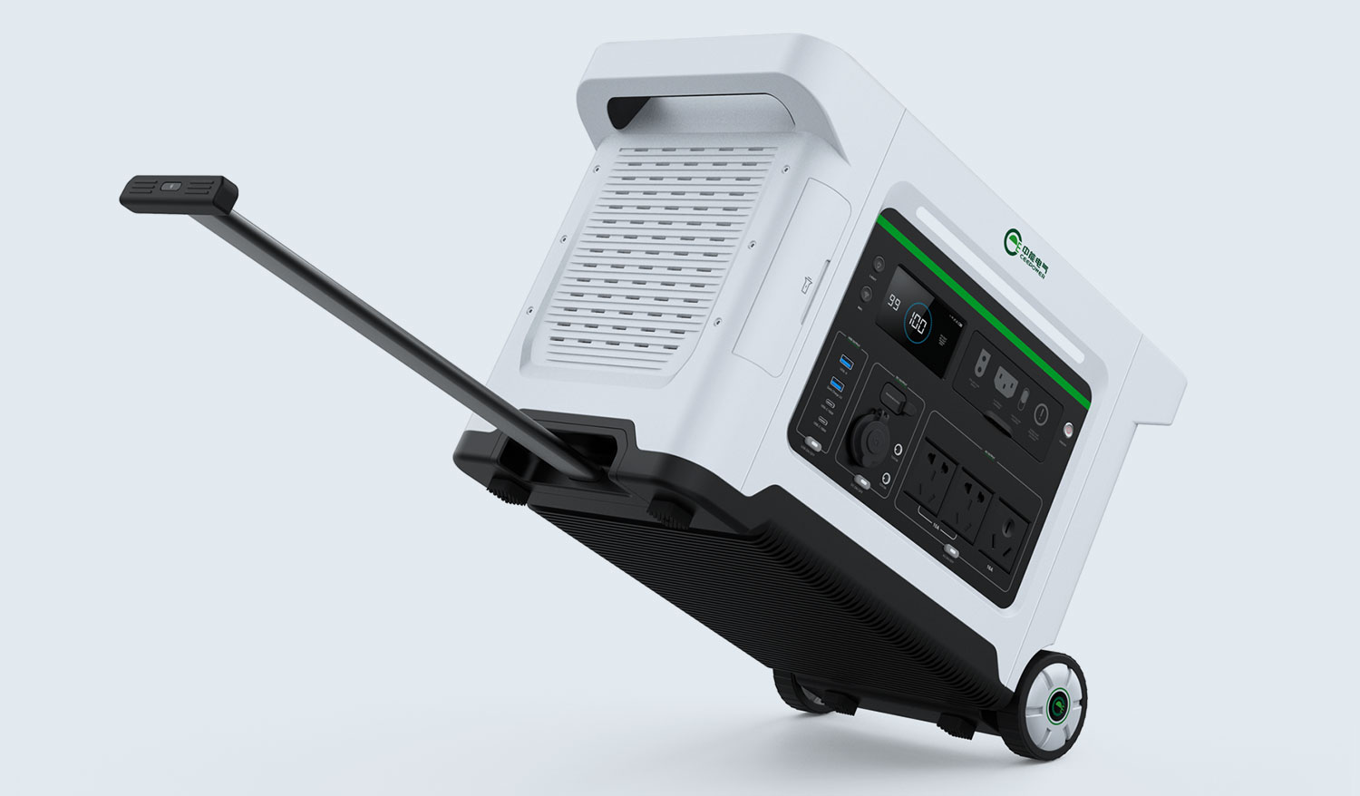 設(shè)備實(shí)用的細(xì)節(jié),如大顯示屏、伸縮手柄、無線WIFI和全地形車輪,可移動(dòng)的磁吸手電筒,以及無線感應(yīng)充電和存儲(chǔ)盒,能夠滿足多場(chǎng)景、多樣化的使用需求。考慮到產(chǎn)品的散熱需求,我們?cè)趥?cè)面設(shè)計(jì)了大型散熱孔,以確保產(chǎn)品內(nèi)部空氣循環(huán),更好的延長(zhǎng)使用壽命;為了不斷追求安全,產(chǎn)品內(nèi)置主動(dòng)式滅火裝置,樹立便攜式儲(chǔ)能行業(yè)安全新標(biāo)桿。